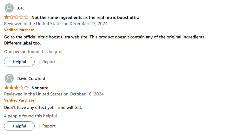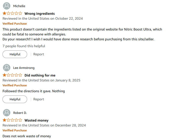 It’s important to note that there have been some complaints from customers who purchased Nitric Boost from unauthorized third-party websites like Amazon, Walmart, or eBay. These complaints involve receiving fake bottles with different ingredients as shown in the couple of screenshots right below, which can be dangerous and ineffective. Therefore, we strongly advise customers to purchase Nitric Boost only from the official website to ensure that they are getting the genuine product.